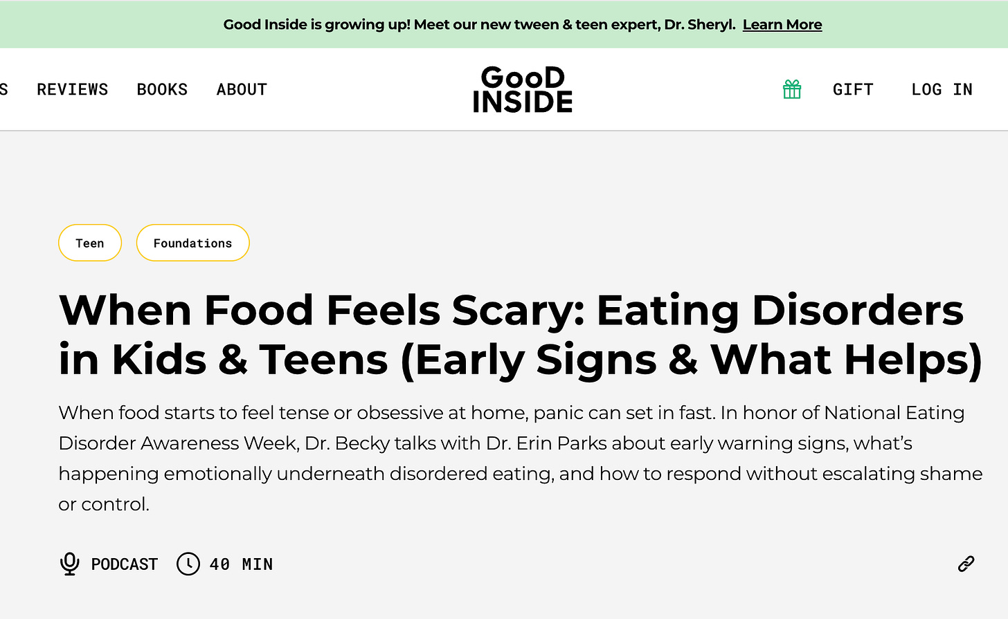 Millennials have had some brilliant parenting experts alongside them online and on social media - such an improvement on Supernanny and Gina Ford IMO - and now those experts are watching their children grow up and starting to cover the issues which affect you. Dr Becky Kennedy’s Good Inside platform and podcast has taken on a new expert to help those with teens and the advice from Dr Sheryl Ziegler is great so far. And I found Dr Becky’s interview with eating disorder specialist Dr Erin Parks (above) extremely helpful if you need that subject tackled for you: it is relevant to all ages not just teens and will help you understand your attitude to food too.